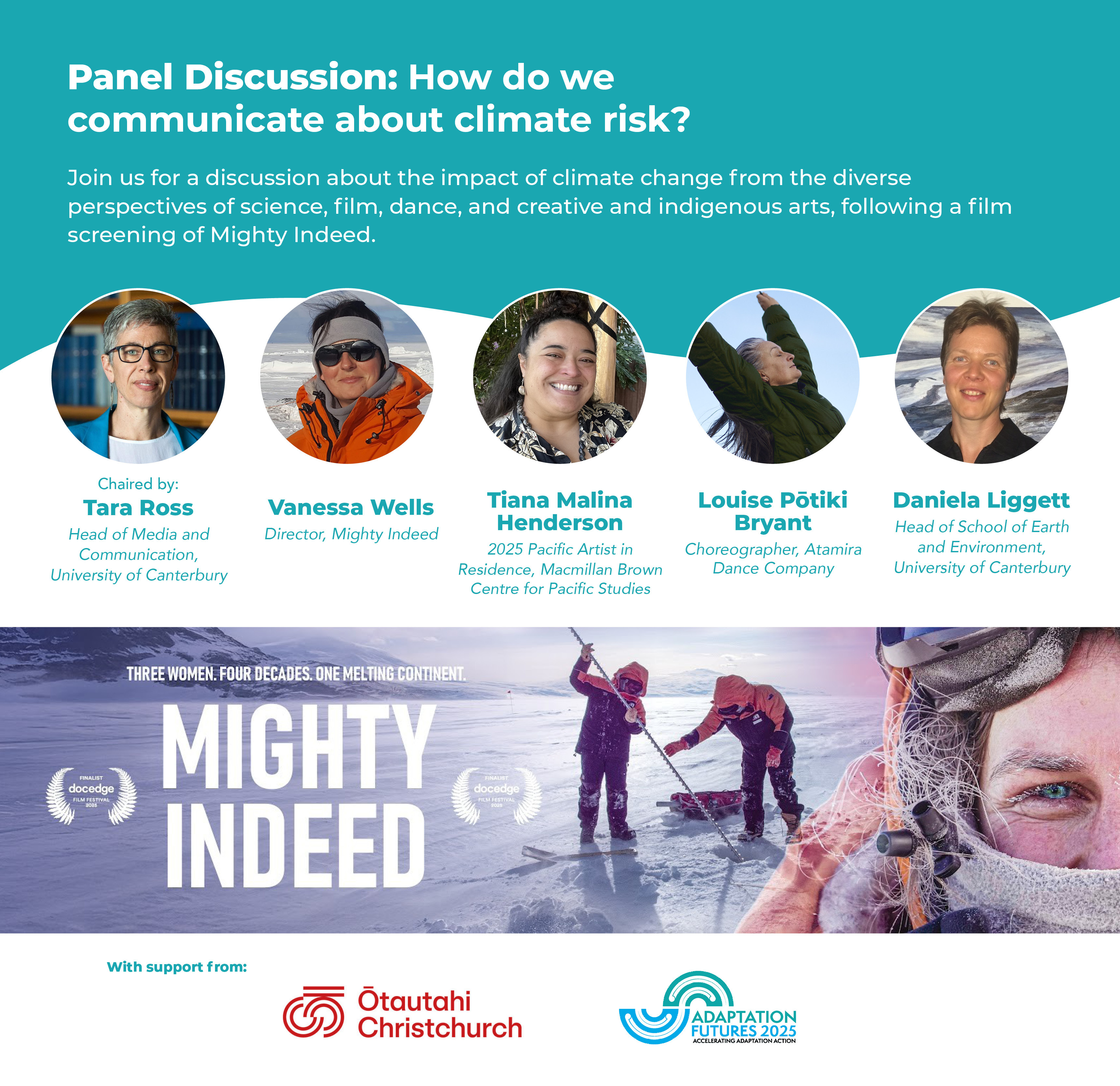 Featuring Vanessa Wells (Director, Mighty Indeed), Louise Pōtiki Bryant (Choreographer, Atamira Dance Company), Tiana Malina Henderson (2025 Pacific Artist in Residence, Macmillan Brown Centre for Pacific Studies), and Daniela Liggett (Head of School of Earth and Environment, University of Canterbury)